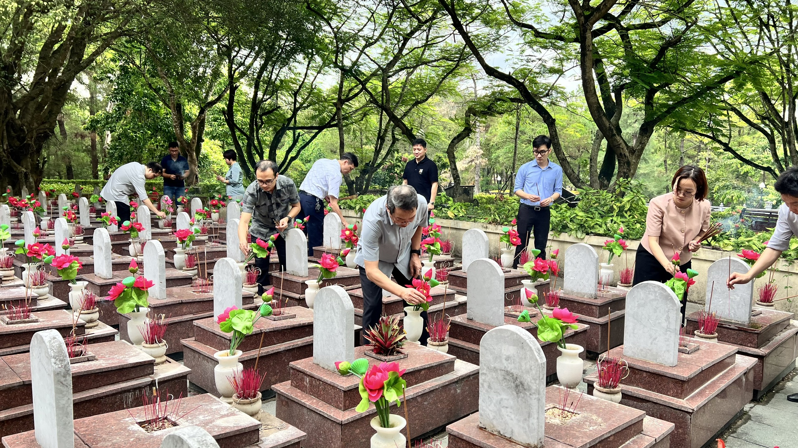 Đồng chí Nguyễn Tấn Vinh – Bí thư Đảng ủy, Viện trưởng Viện Kinh tế xây dựng và các đại biểu dâng hương tại Nghĩa trang Liệt sĩ Quốc gia Đường 9