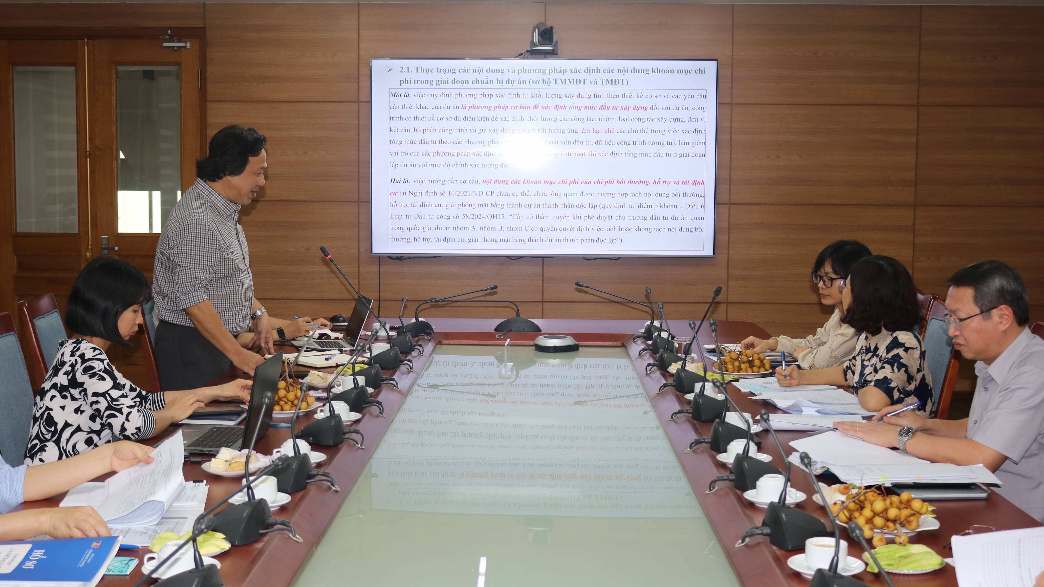 Tại buổi nghiệm thu, ThS. Phạm Huy Cường đã thay mặt nhóm nghiên cứu trình bày tóm tắt các kết quả đạt được. Đề tài tập trung phân tích thực trạng quản lý chi phí sau 18 năm vận hành cơ chế phù hợp với thị trường, nhận diện những bất cập trong phương pháp lập tổng mức đầu tư, dự toán hiện hành và sự cần thiết phải đổi mới theo tinh thần Luật Xây dựng số 135/2025/QH15. Nhóm nghiên cứu đã đề xuất các giải pháp trọng tâm như: đơn giản hóa bảng dự toán chi phí xây dựng; quy định duy nhất một định mức tỷ lệ cho chi phí gián tiếp và ứng dụng dữ liệu lớn (Big Data) trong quản lý giá…