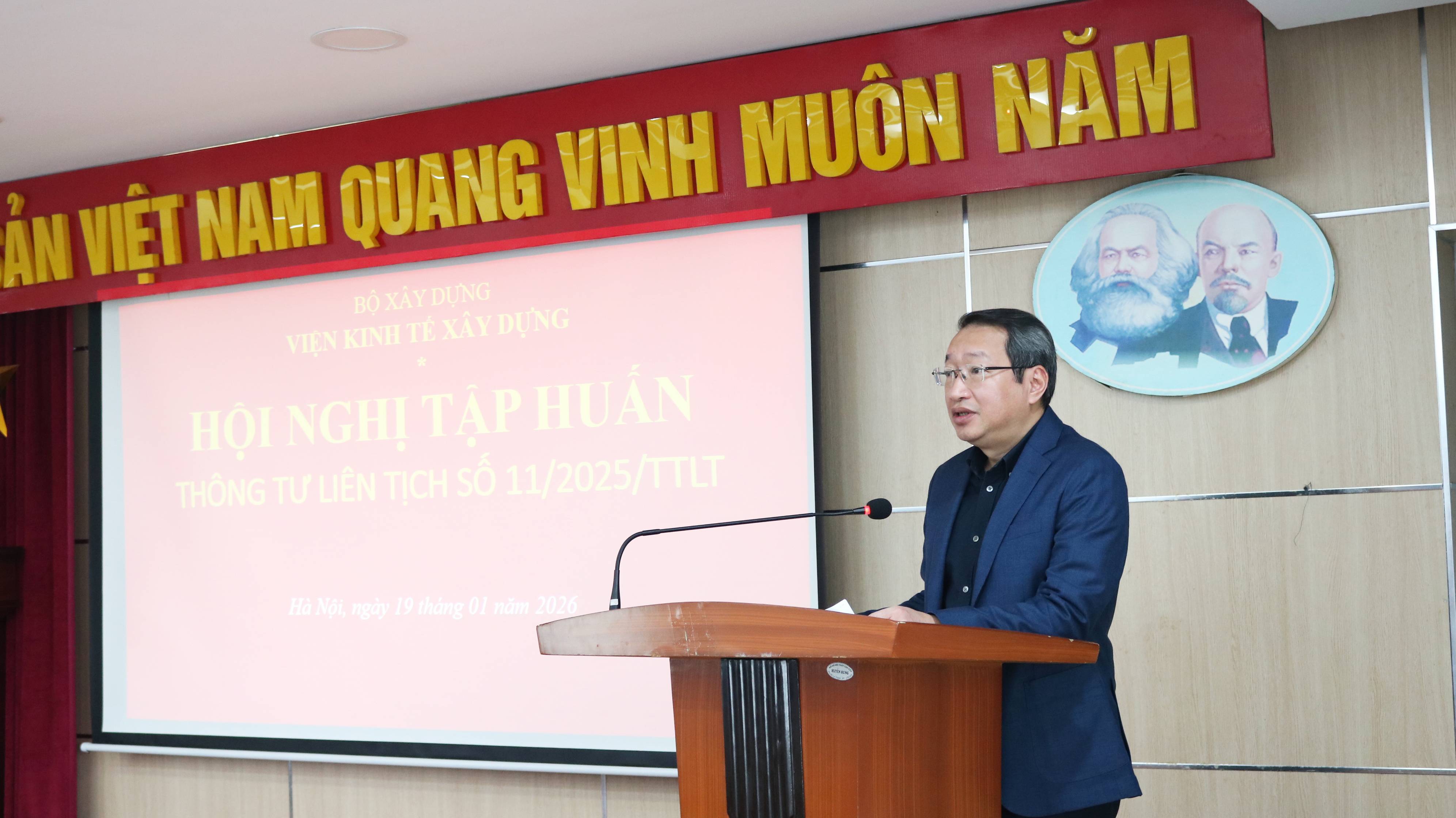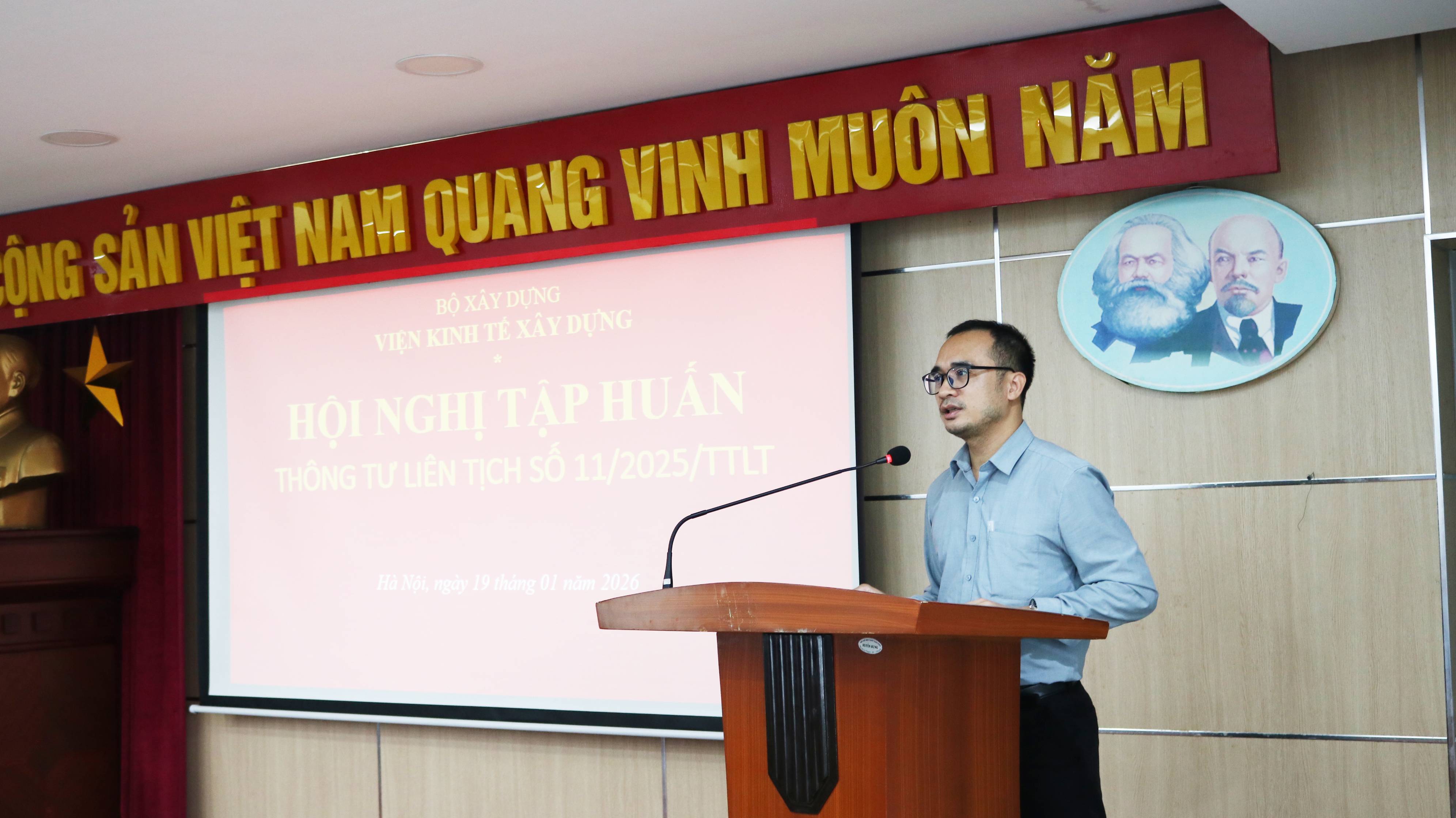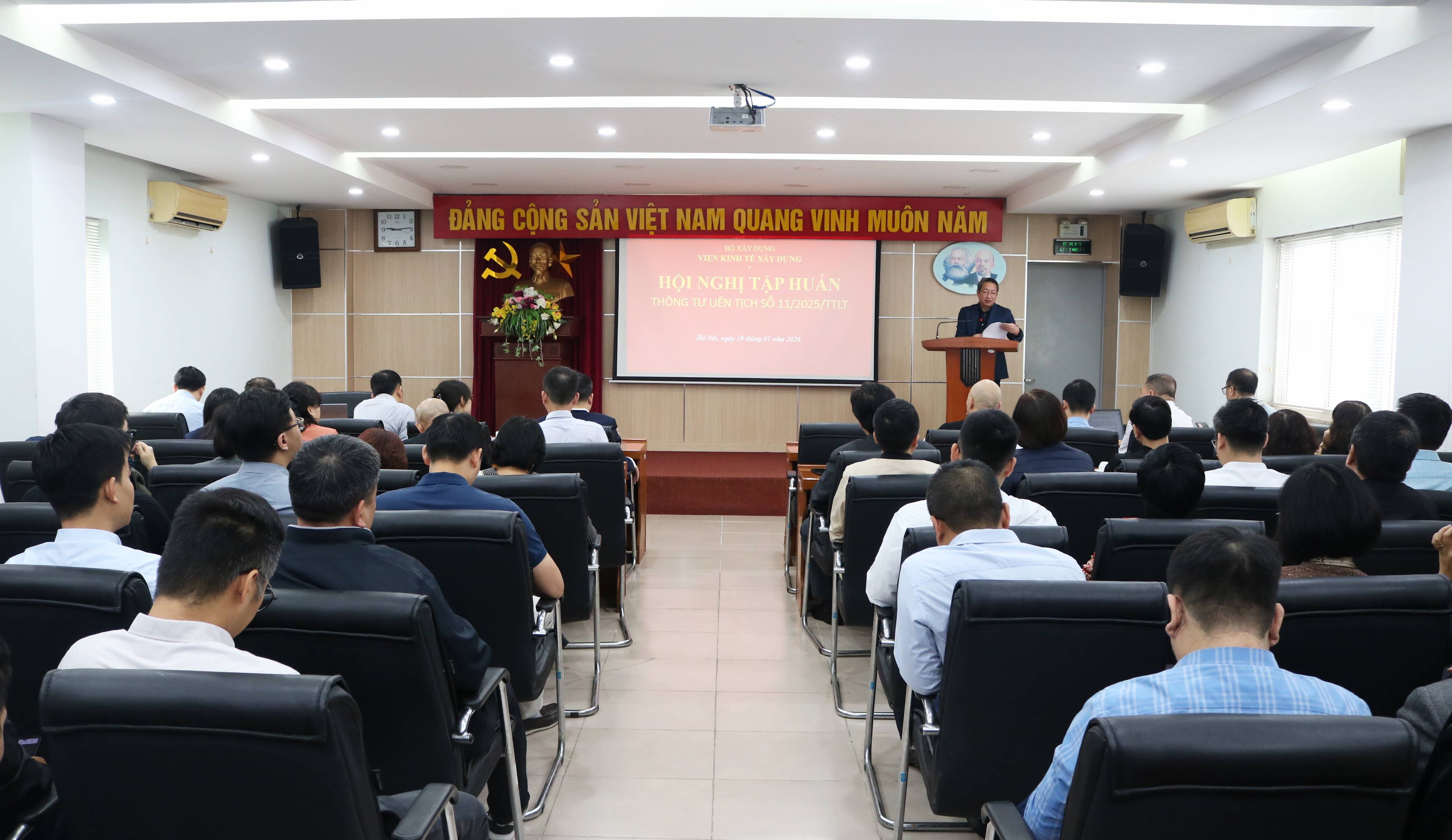 Thực hiện Kế hoạch công tác năm 2026, sáng ngày 19/01/2026, Viện Kinh tế xây dựng đã tổ chức Hội nghị tập huấn, phổ biến Thông tư liên tịch số 11/2025/TTLT hướng dẫn việc xác định lãng phí để áp dụng trong xử lý các tội phạm liên quan đến lãng phí.